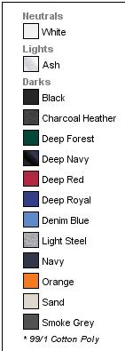 | Color: | white, ash, black, charcoal-heather, denim-blue, deep-forest, deep-red, deep-royal, light-steel, navy, orange, sand, smoke-gray, natural |