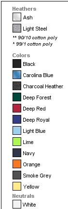 Charcoal Heather, Oxford Grey, Safety Green and Safety Orange are 60/40 cotton/polyester