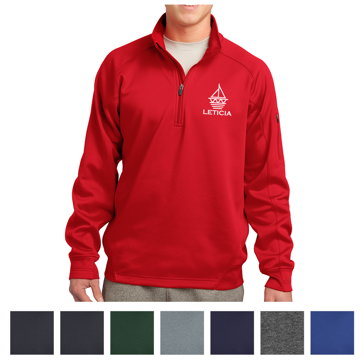 100% Polyester. Pill-Resistant And Snag-Resistant Face. Matte Finish And Brushed Backing For Comfort. Double-Knit Construction. Taped Neck. Chin Guard For Additional Comfort. Cadet Collar. Raglan Sleeves. Left Sleeve Zippered Pocket. Half Rib Knit, Half Self-Fabric Cuffs And Hem.